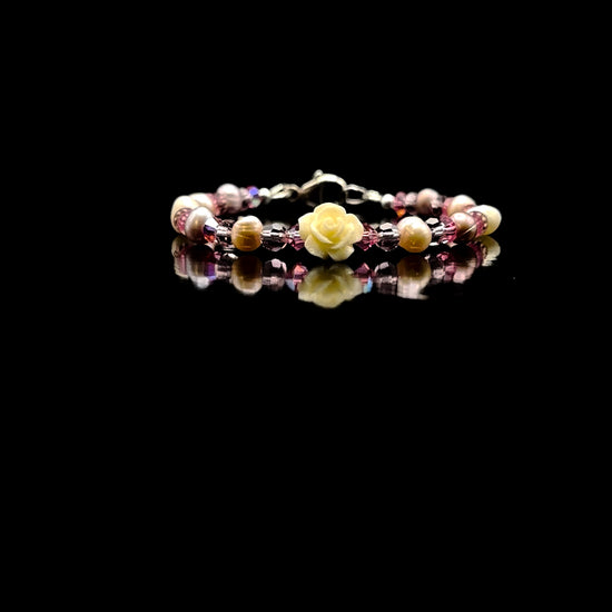 White Rose encompassed by the glistening of pretty pink and violet Czech Glass Beads segmented by Freshwater Pearls.